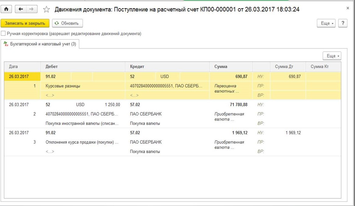Во взятом нами примере, второй проводкой зачисляются валютные средства, а третья проводка определяет потери на разнице курсов и переводит их в категорию расходов.