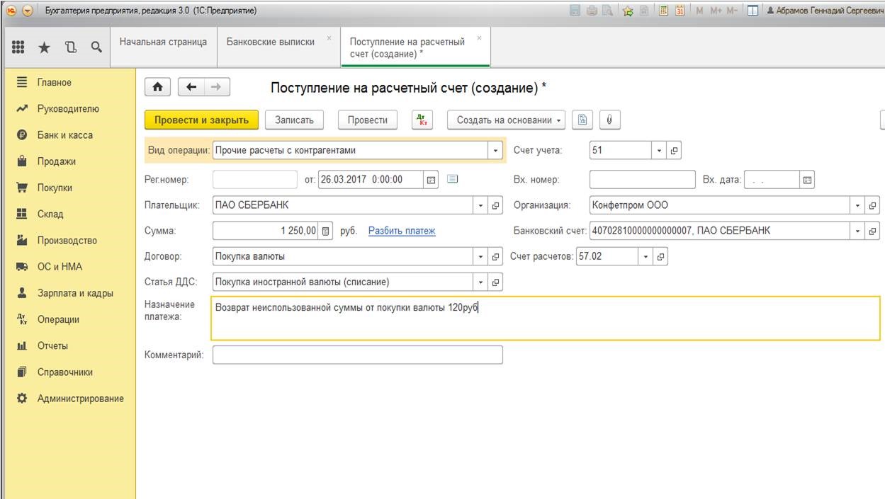 Поскольку перечисление для банка составляло 75 тыс. рублей, а покупка валюты обошлась в 73,75 тыс. рублей, образовавшуюся разницу необходимо возвратить на счет. Для этого нам опять понадобится документ, знакомый по предыдущим шагам, «Поступление на расчетный счет»: