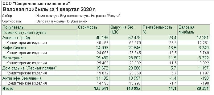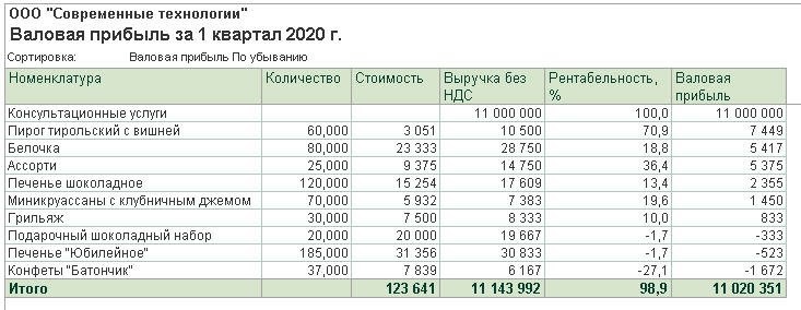 Автоматически в начале перечня указываются номенклатурные позиции, которые были реализованы с наибольшей валовой прибылью и рентабельностью.
