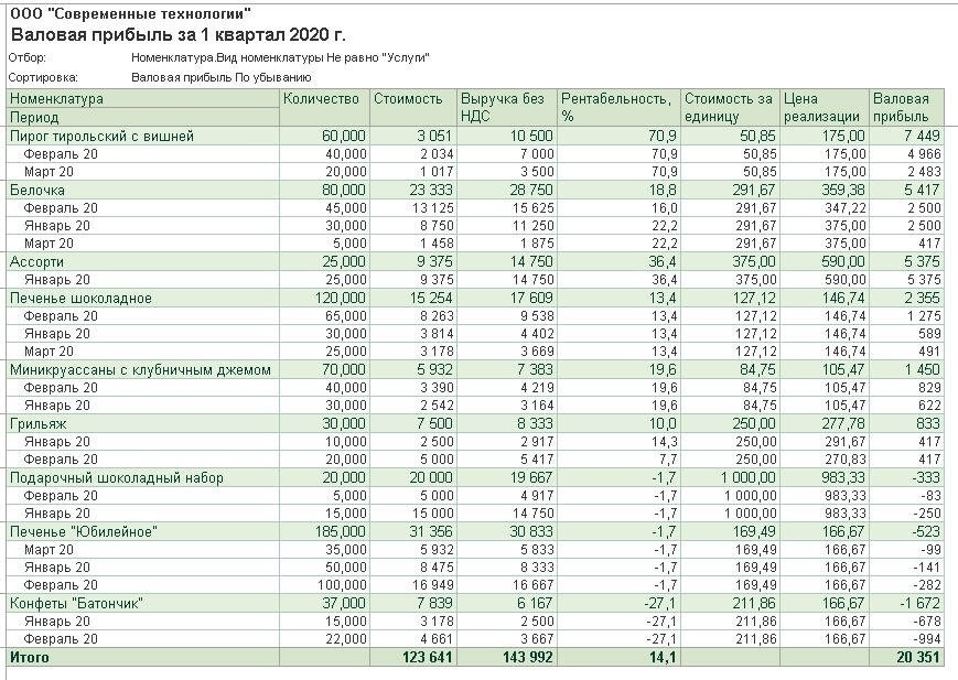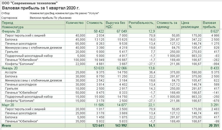 Через отчет «Валовая прибыль» имеется возможность понять, какие направления деятельности или продукция пользуются наибольшим спросом и насколько их продажи эффективны для компании.