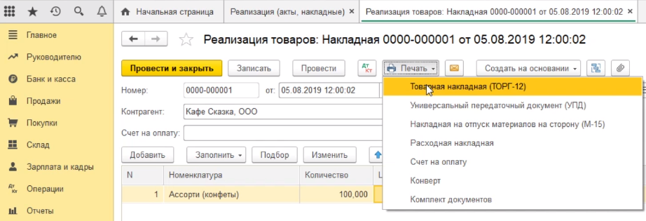 Далее переходим по кнопке печать в товарную накладную (Торг-12).