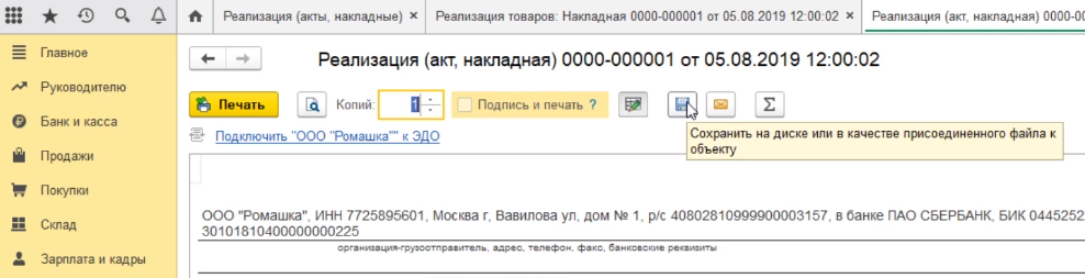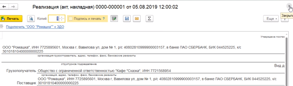 Мы его можем оттуда распечатать, переслать по почте. По завершению действий с документом-реализации экранной формы, закрываем его по кнопочке закрыть - крестик в правом верхнем углу.