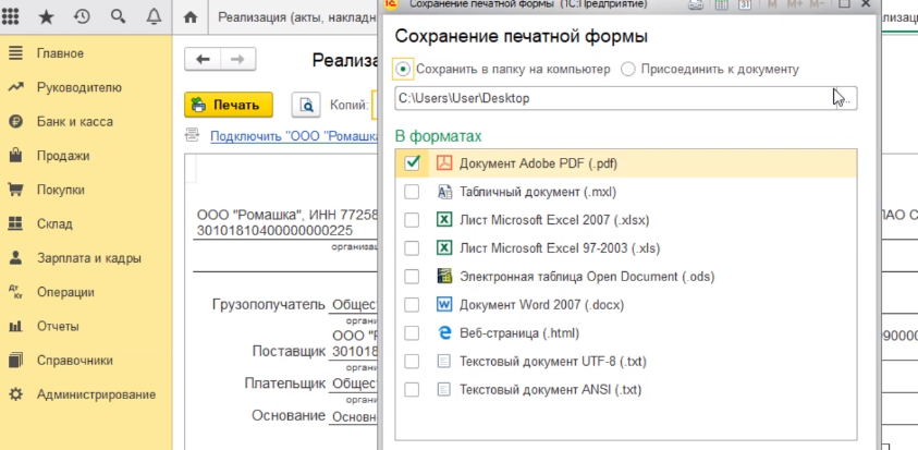 При нажатии на эту кнопочку открывается окно выбора формата и места сохранения. Здесь представлены самые ходовые форматы вордовский, экселевский, пдф формат. Мы выбрали пдф формат.