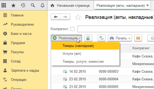 В журнале документов реализации создаем новый документ. Кнопочка реализация предлагает выбрать тип документа. А так как речь идет о реализации товаров, мы выбираем тип - товары (накладная).