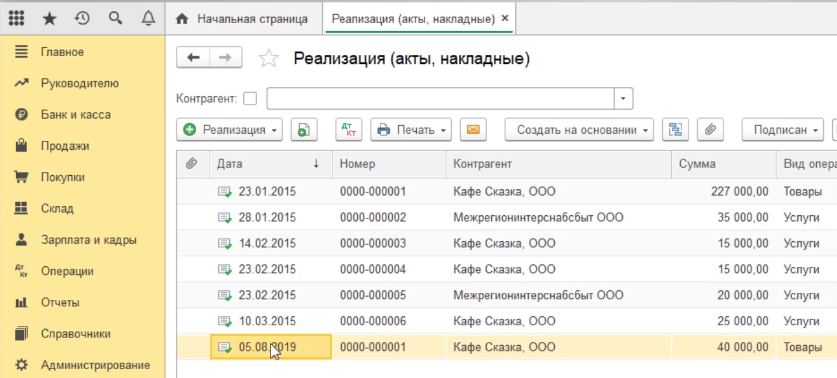 Для этого идем в раздел продажи, реализация (акты, накладные).