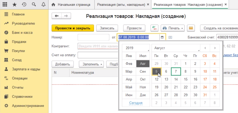 В реквизитах документа. Дата документа заполняется автоматически по умолчанию - рабочей датой компьютера. Если нам нужно изменить дату, мы можем воспользоваться встроенным календариком и выбрать ту дату, которая нам требуется. Например, поменяли на пятое августа.