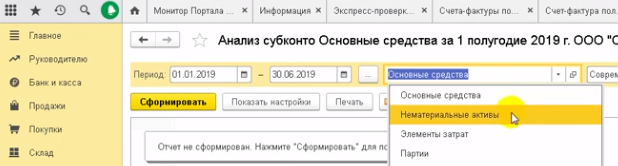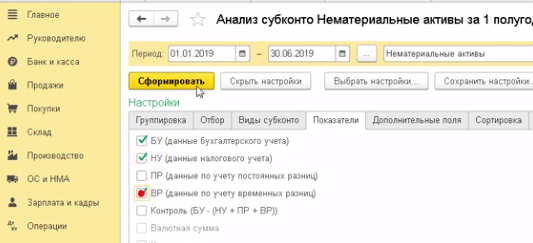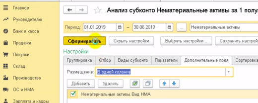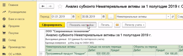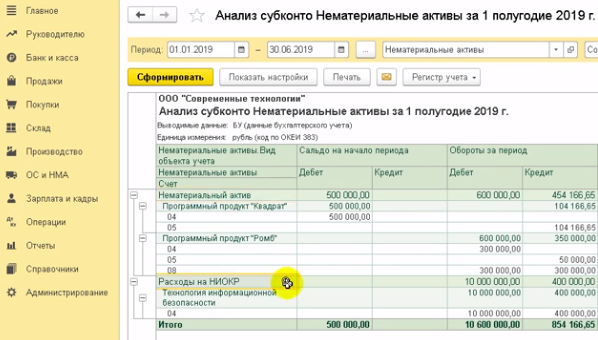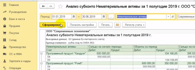 В качестве субконто выберем нематериальные активы и сформируем отчет.