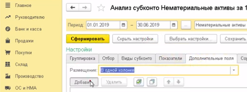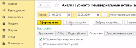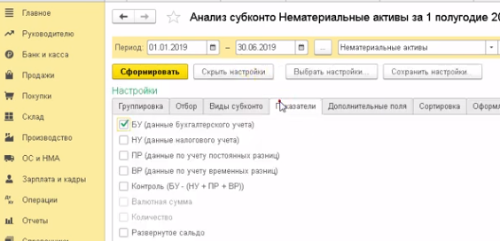 Отчет формируется по каждому объекту и детализируется по счетам. Мы можем проанализировать первоначальную стоимость каждого нематериального актива, накопленную амортизацию и остаточную стоимость. Остаточная стоимость НМА - это свернутая сальдо по счетам 04 и 05. Поэтому в настройках отчета, в закладке показатели, флаг развернутое сальдо устанавливать не нужно.