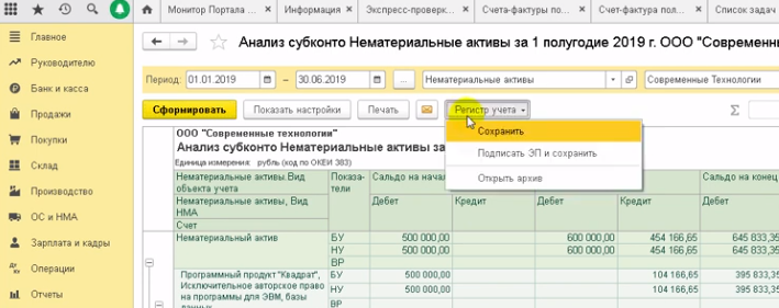 Сформированный отчет можно сохранить в качестве регистра учета.