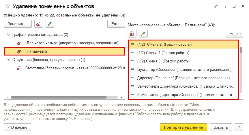 - Заменить удаляемый объект графиком «Все графики и все позиции штатного расписания», предварительно отредактировав все, связанные с ним документы.