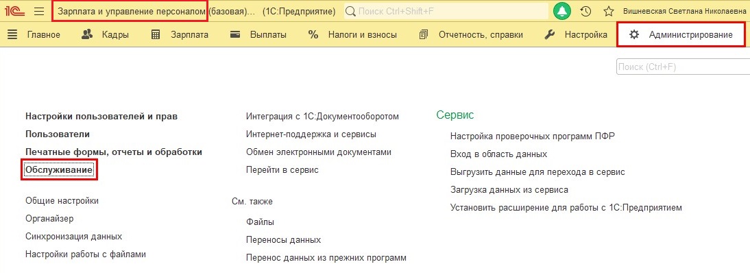 - Открыв раздел «Администрирование», выбрать там пункт «Обслуживание». Здесь нужно будет выбрать процедуру «Удаление помеченных объектов».