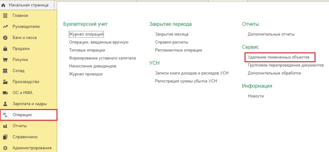 - В третьей версии программного обеспечения для Бухгалтеров эта функция может называться «Удаление помеченных объектов», но найти ее можно в разделе «Опции».