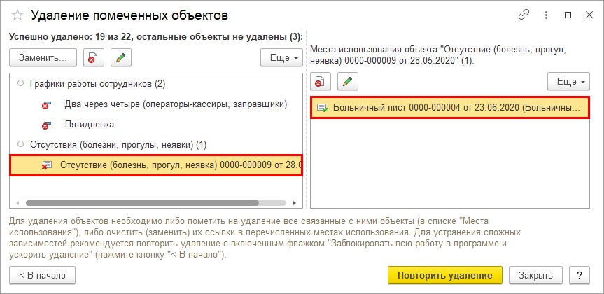 В ситуации, созданной в качестве примера таким объектом стал документ под названием «Отсутствие (болезнь, прогул, неявка)». Он связан с документом «Больничный лист», и не может быть удален. Ведь он является основанием для больничного.