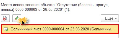 - Если документа, озаглавленных, как «Отсутствие (болезнь, прогул, неявка)», и на их основании создано два документа «Больничный лист», необходимо открепить от одно из них документ об отсутствии.