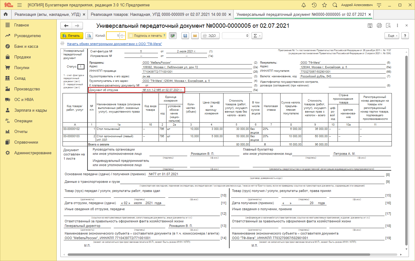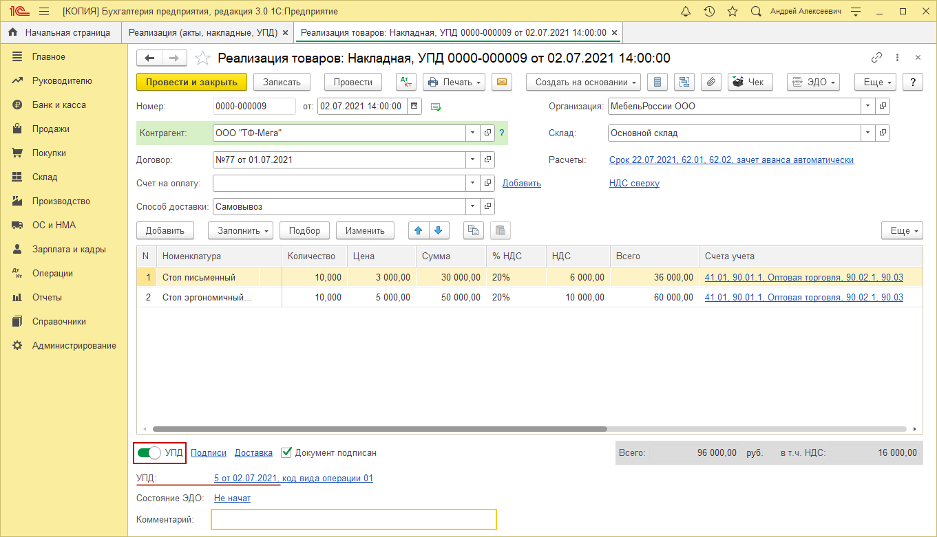 Затем нужно включить переключатель «УПД» под таблицей документа реализации — в этом случае его цвет станет зеленым. Когда пользователь проведет документ, программа создаст новый «Счет-фактура выданный на реализацию». Его также можно создать через кнопку «Выписать счет-фактуру».