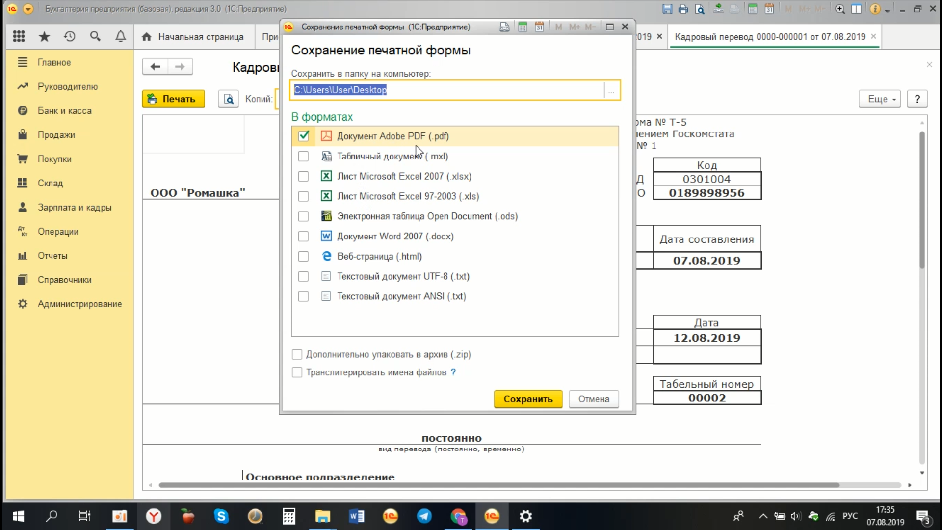 А далее, соответственно, у нас есть возможность, либо его распечатать непосредственно из самого документа. Либо сохранить в электронном виде с помощью кнопки «Сохранить на диск» в нужном формате, либо это будет документ Word, либо таблица Excel, либо, как у нас документ в PDF формате и выбираем, соответственно, место на диске, куда мы его будем сохранять, в нашем случае  - это Рабочий стол, сохраняем.
