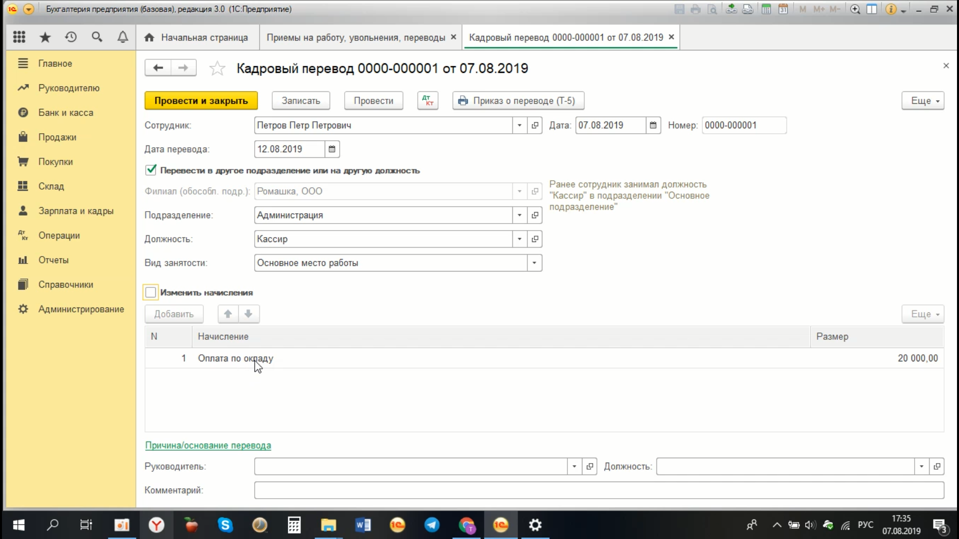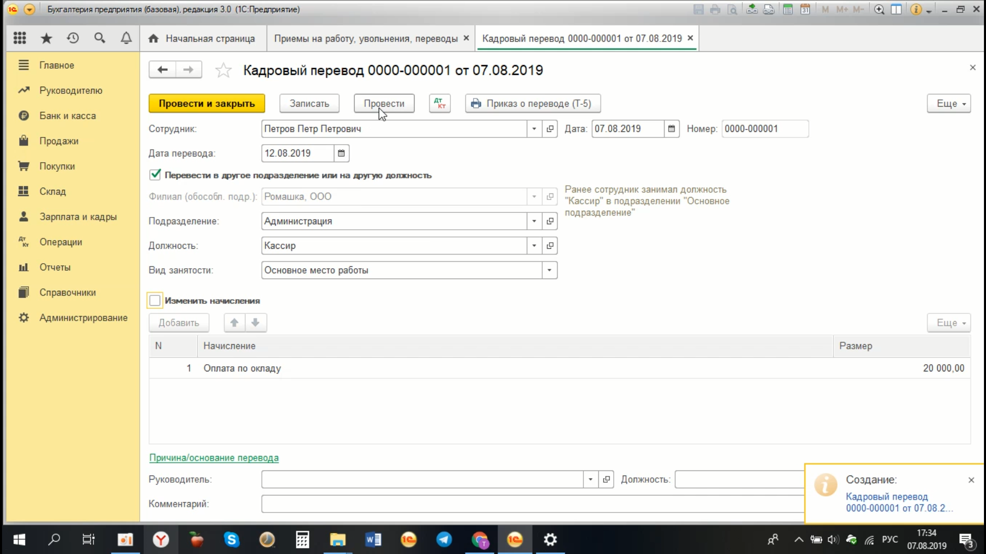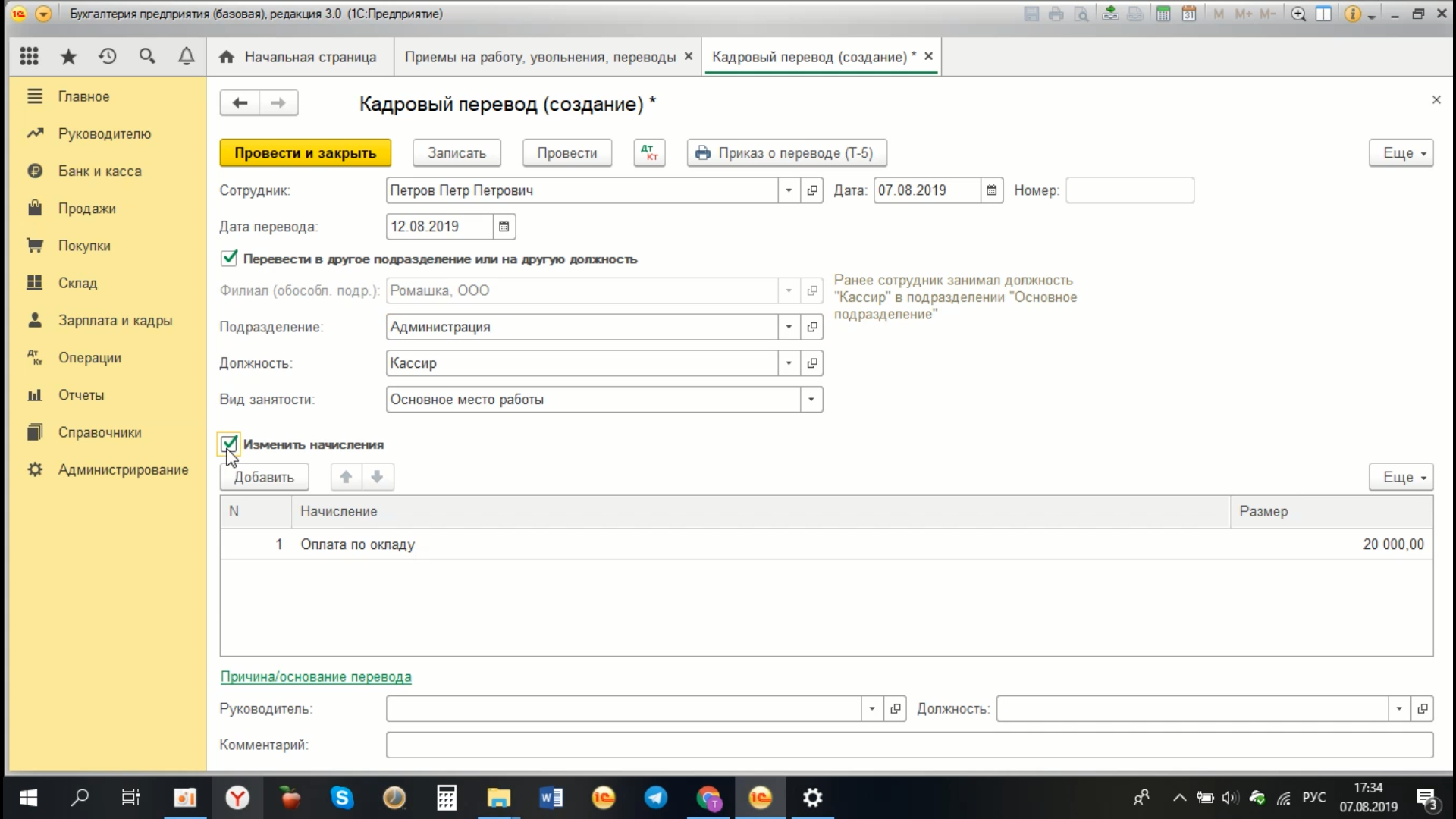 Таким образом, в программе оформляется кадровый перевод с указанием нового подразделения, при необходимости новой должности, и в случае изменения, и новый вид начисления у сотрудника.