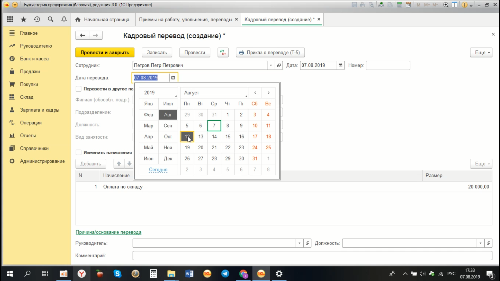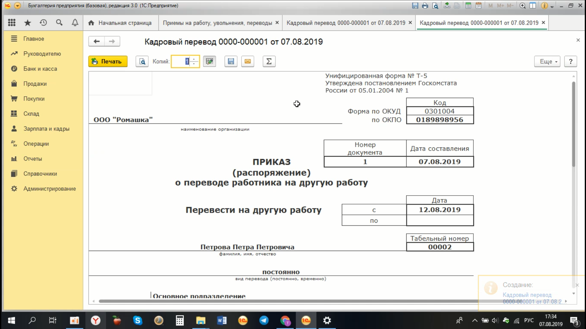 Открывается форма для заполнения. В документе «Кадровый перевод», мы указываем сотрудника, которого мы переводим в новое подразделение, например в нашем случае - это Петров Петр Петрович.