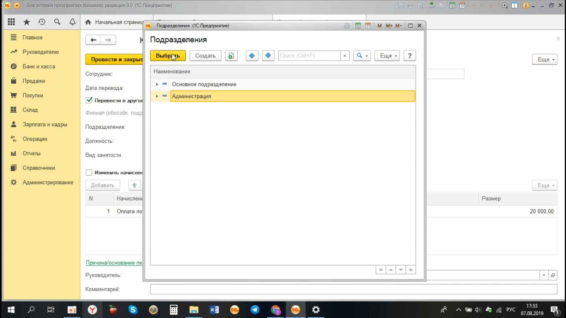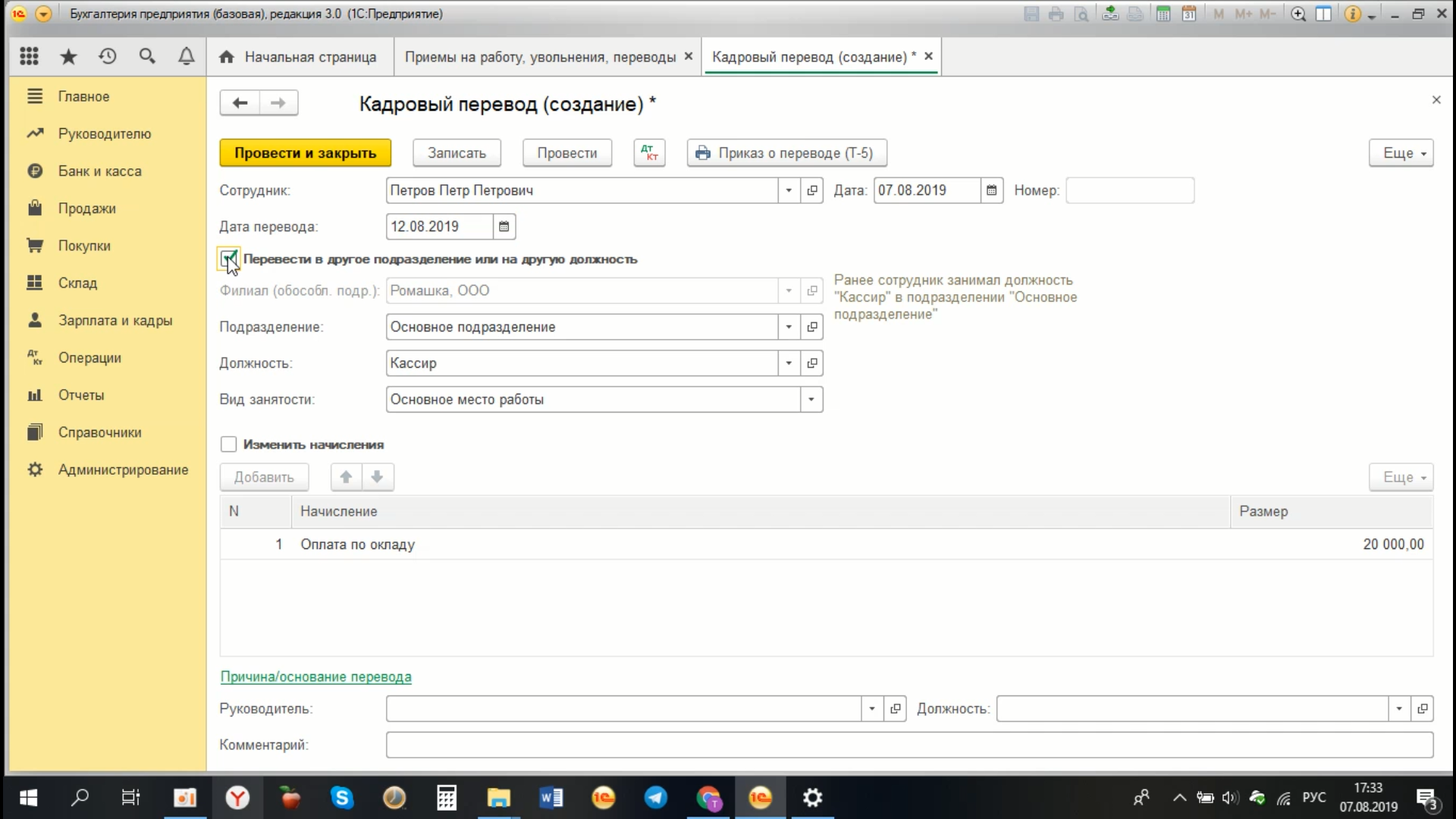 Как в 1С Бухгалтерия 8.3 перевести сотрудника в другое подразделение