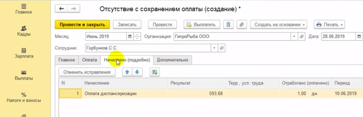 Для выбранного сотрудника указать вид отсутствия – диспансеризация
