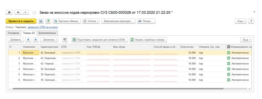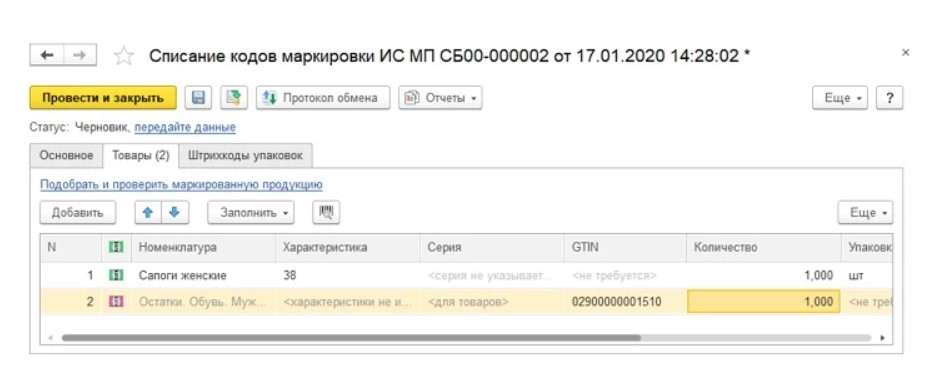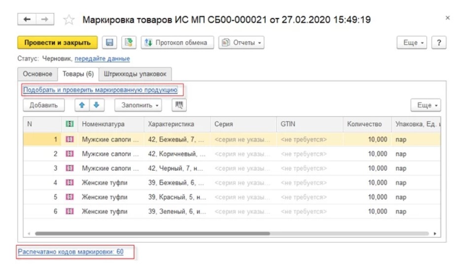 Выполнение маркировки обуви в «1C:УТ»