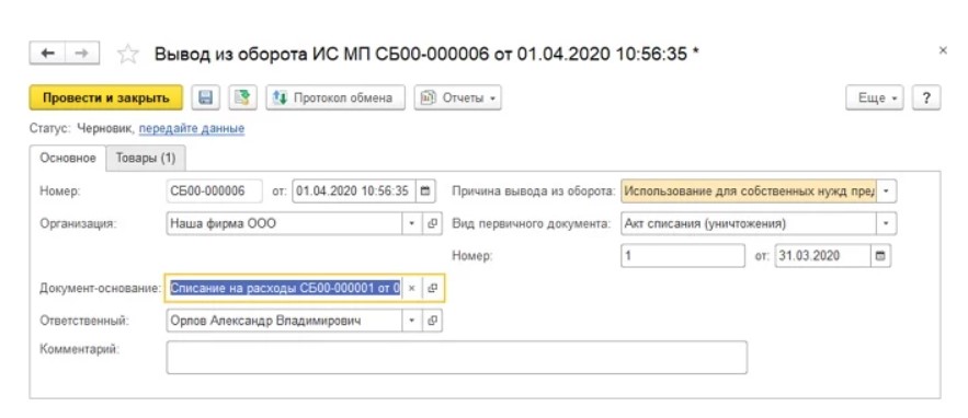 От пользователя при выводе из оборота продукции нужно указывать причину этого действия. Для отображения товарного движения в учете следует предварительно создавать документ-основание. Документ выбирается в строке с соответствующим названием. Вместе с причиной вывода, указывается номер, вид и дата первичного документа.