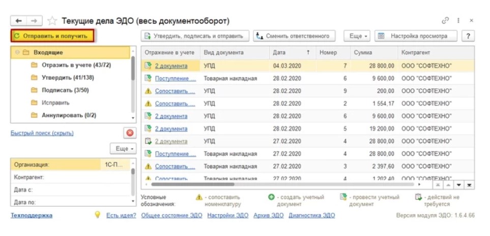 Пример подразумевает продажу обуви именно оптовому продавцу другим участником движения продукции. Процедуру нужно выполнять через оператора ЭДО, причем, у продукции есть маркировка и необходимые данные, которые содержатся в УПД, направляемом продавцом покупателю. В разделе «Текущие дела ЭДО», размещены все входящие электронные документы. Чтобы принять новые УПД, нужно нажать «Отправить и получить» или выполнить регламентное задание на сервере.