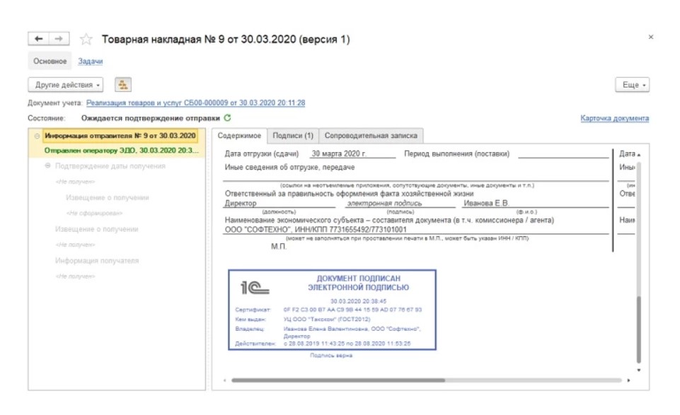 Полученный УПД подлежит подписи при помощи ЭП и отправке.