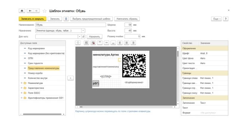 Пользователю нужно настроить шаблон этикетки и тип номенклатуры в зависимости от того, про какую категорию обуви идет речь.