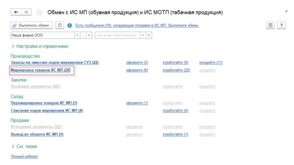 Далее нужно нажать «Провести и закрыть», а потом в разделе «Обмен с ИС МП» нажать строку с названием «Маркировка товаров ИС МП».