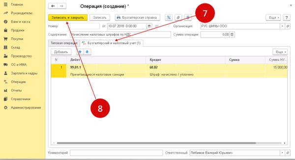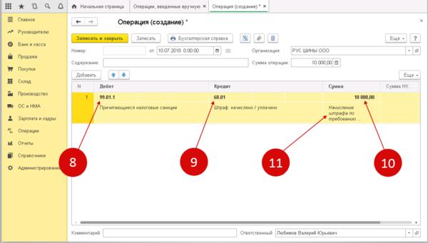 В поле «Дебет» пользователь указывает наименование счёта 99.01.1 «Прибыли и убытки». Далее открывается справочник с несколькими пунктами. Среди них необходимо выбрать «Причитающиеся налоговые санкции». В поле «Кредит» указывается счет бухгалтерского учета , по которому учитываются текущие расчеты по налогу. Именно по нему были начислены штрафные санкции.