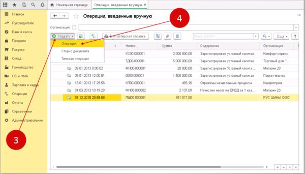 Шаг 1. Необходимо создать новую ручную операцию в версии программы 1С 8.3. Пользователь переходит. В раздел «Операции» и кликает на надпись «Операции, введенные вручную». Через несколько секунд пользователю откроется окно для ручных операций.