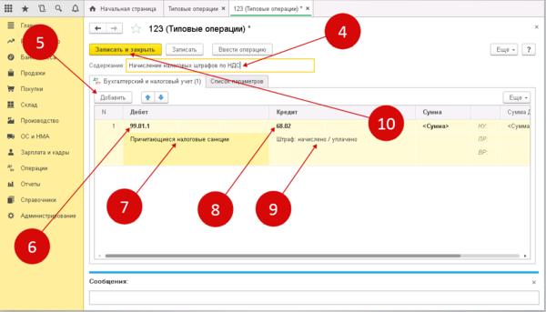 - в пункте «Содержание» указываются такие сведения, как наименование типовой операции (примером услуги становится «Начисление налоговых штрафов по НДС»);