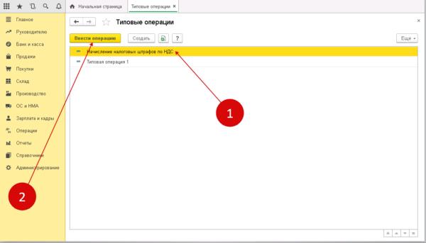 Шаг 2. Владельцу необходимо создать проводку по начислению штрафа в программе 1С 8.3 при помощи типовой операции. Для успешного начисления штрафа при помощи функционала можно зайти в общий список операций (выполняется по шагу 1), а затем кликнуть на нужную и нажать на клавишу «Ввести операцию»