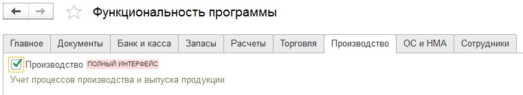 Что нужно сделать сначала? Важно указать, что организация собирается вести учет всех производственных процессов. Найдите пункт «Администрирование», нажмите на него и перейдите в «Функциональность». Далее вы увидите слово «Производство». В этой вкладке нужно поставить флаг.