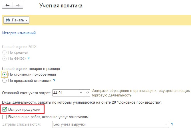 Зайдите в отдел «Главное», найдите там пункт «Учётная политика». Поставьте флажок на «Выпуске продукции». Если вы ничего не забыли, главные настройки программы можно считать завершенными. Они подходят абсолютно для всех компаний, которые занимаются собственным производством. Теперь можно перейти к особым характеристикам предприятий, их индивидуальным чертам.