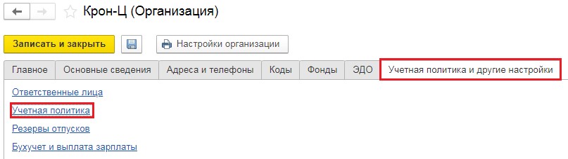 • далее нужно выбрать компанию и зайти во вкладку "Учетная политика и другие настройки" и нажать ссылку "Учетная политика";