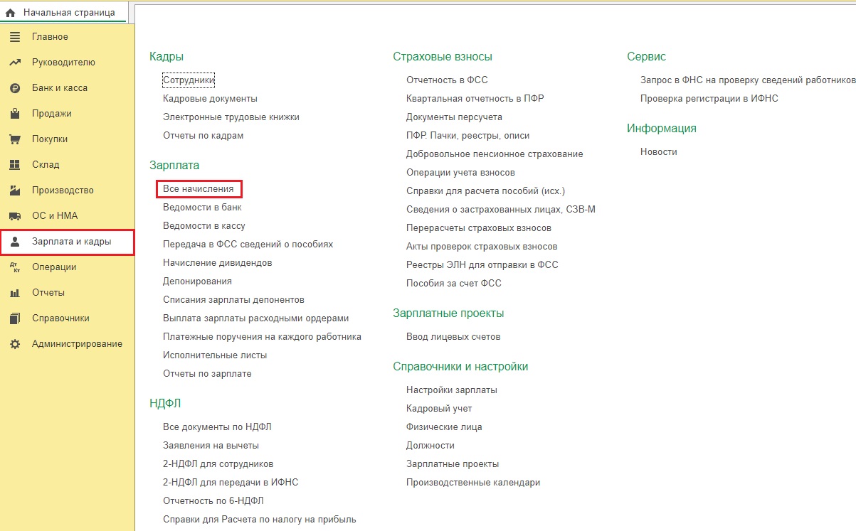 Для этого нужно зайти во вкладку "Зарплата и кадры" и выбрать раздел "Все начисления".