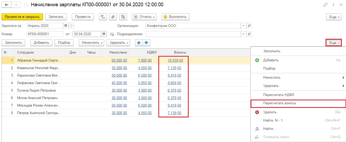После этого из списка документов по начислению зарплаты выбрать те, которые относятся к апрелю и маю. Зайти в документ, нажать на нижнюю кнопку "Еще", открыть контекстное меню и нажать "Пересчитать взносы".
