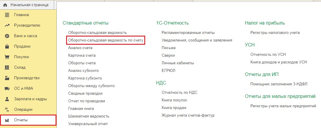 Чтобы проанализировать суммы переплаты, нужно сформировать оборотно-сальдовую ведомость по счету 69. Для этого надо зайти в раздел "Отчеты".