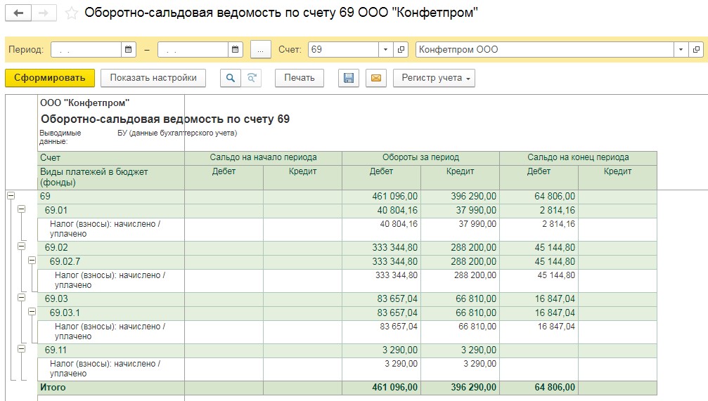 При формировании ОСВ по счету 69 лучше не указывать период и поставить флажок "По субсчетам". По дебету "Сальдо на конец периода" можно увидеть, какой размер переплаты имеется по тому или иному виду страховых взносов.
