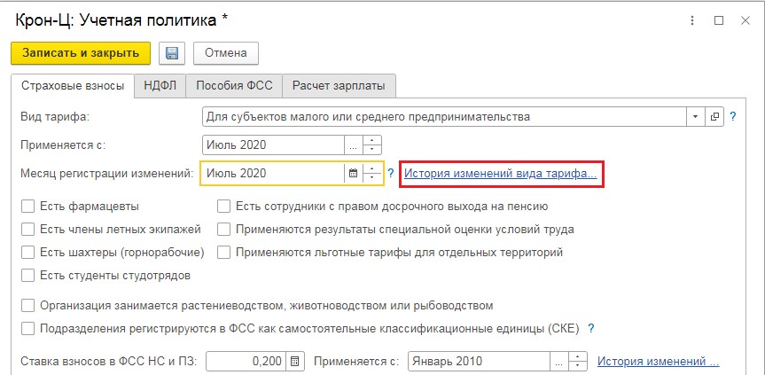 • в новом окне пройти по ссылке "История изменений вида тарифа", чтобы указать использование нового тарифа. Применить этот тариф нужно с апреля 2020 г.;