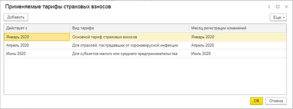 • в открывшемся окне можно увидеть все тарифы страхвзносов, применяемые компанией, и периоды их использования.