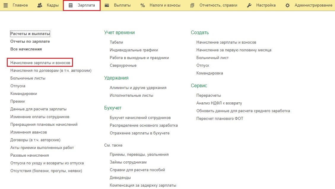 Для проверки правильности пересчета страхвзносов нужно зайти во вкладку "Зарплата" и выбрать ссылку "Начисление зарплаты и взносов".