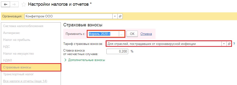 В программе 1С: ЗУП ред. 3.1 (начиная с релиза 3.1.13.220) установлен новый тариф страхвзносов специально "Для отраслей, пострадавших от коронавирусной инфекции".