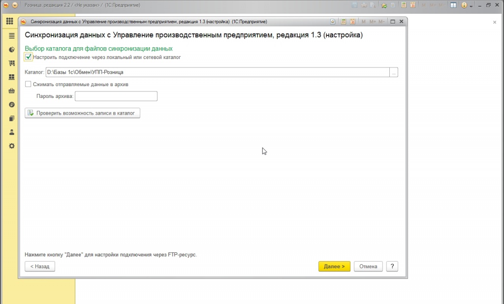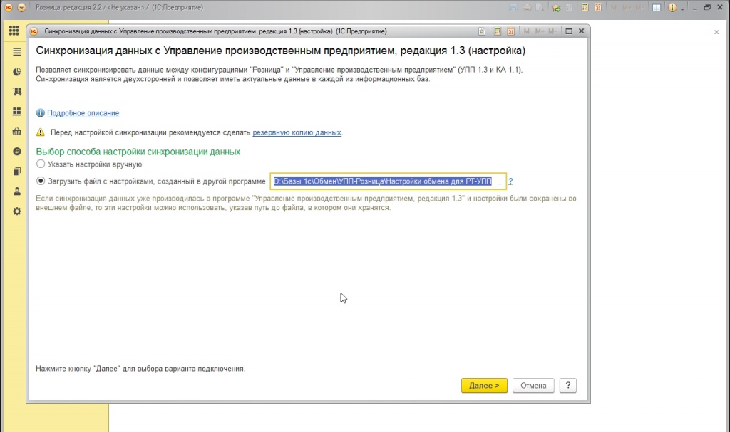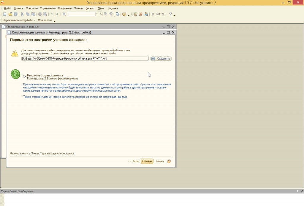 Формируем файл для настройки синхронизации для «РОЗНИЦА» (в дальнейшем это позволит отказаться от повтора действий). Если выполнить отправку данных необходимо сразу после настройки обмена, в соответствующей строке ставим флажок.