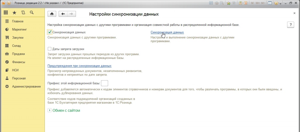 Кликаем на «Создать обмен с «Розница» в настройках синхронизации информации