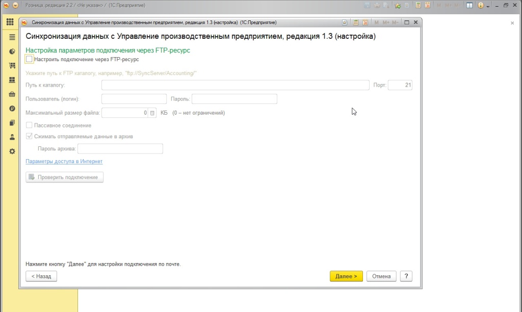 Если подключение осуществляется через сетевой каталог, на предложения программы выполнить настройку подключения по э-мейл и с помощью адреса FTP можно не обращать внимание. Кликаем на кнопку «ДАЛЕЕ».