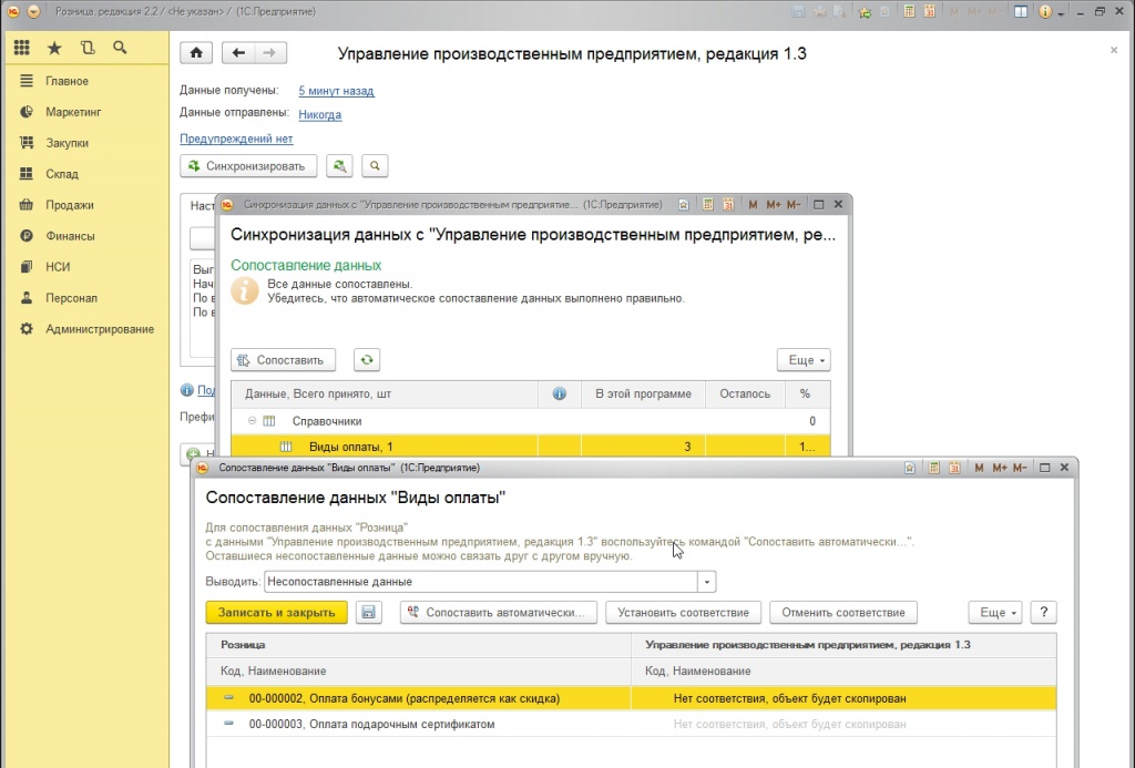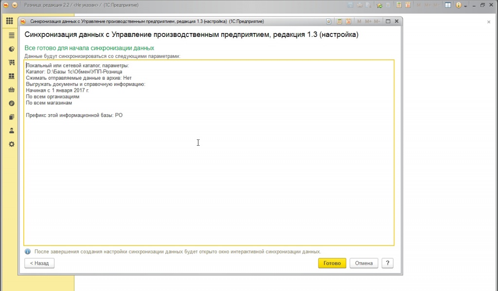 Процедура синхронизации данных в 1С успешно подошла к концу.