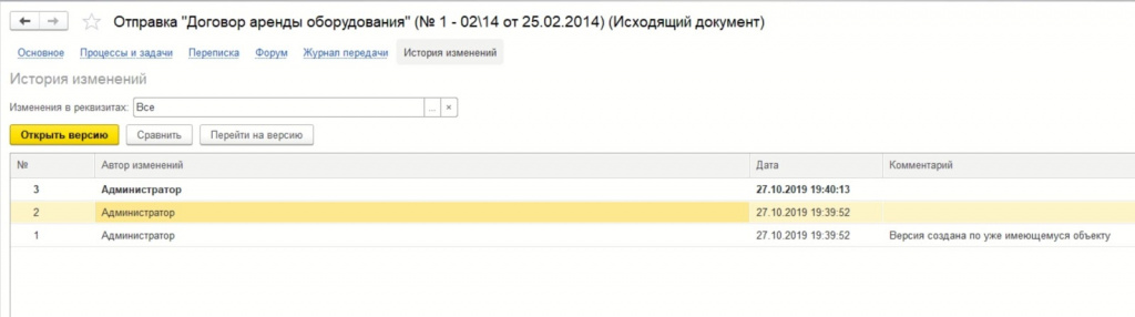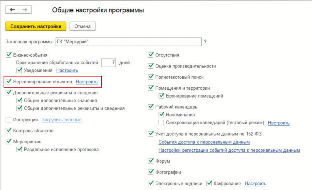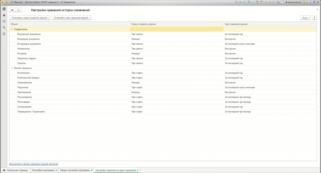 Там дается список всех объектов, для которых можно настроить версионирование. То есть, система будет не только фиксировать информацию об изменениях (кто и когда их внес). При необходимости пользователь сможет вернуться к более ранней версии документа.